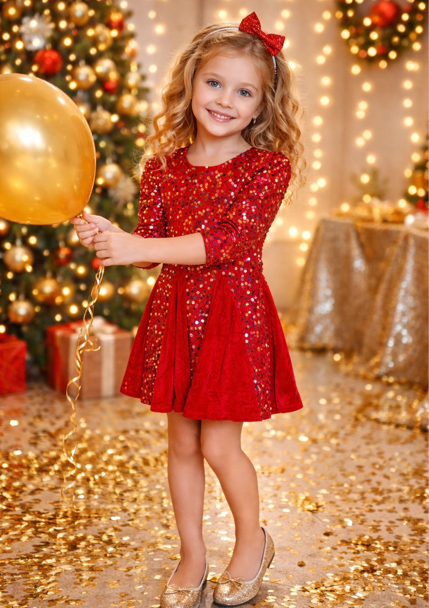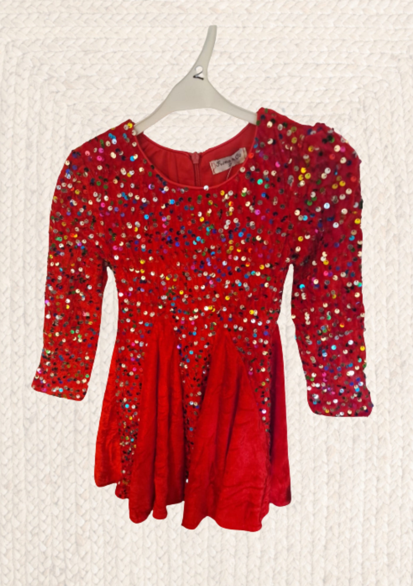Dit jurkje is er één die je niet over het hoofd ziet. Felrood, volledig bezet met kleurrijke pailletten en gemaakt om te stralen. Perfect voor kerst, feestjes, verjaardagen of gewoon omdat jouw meisje zin heeft om te shinen.