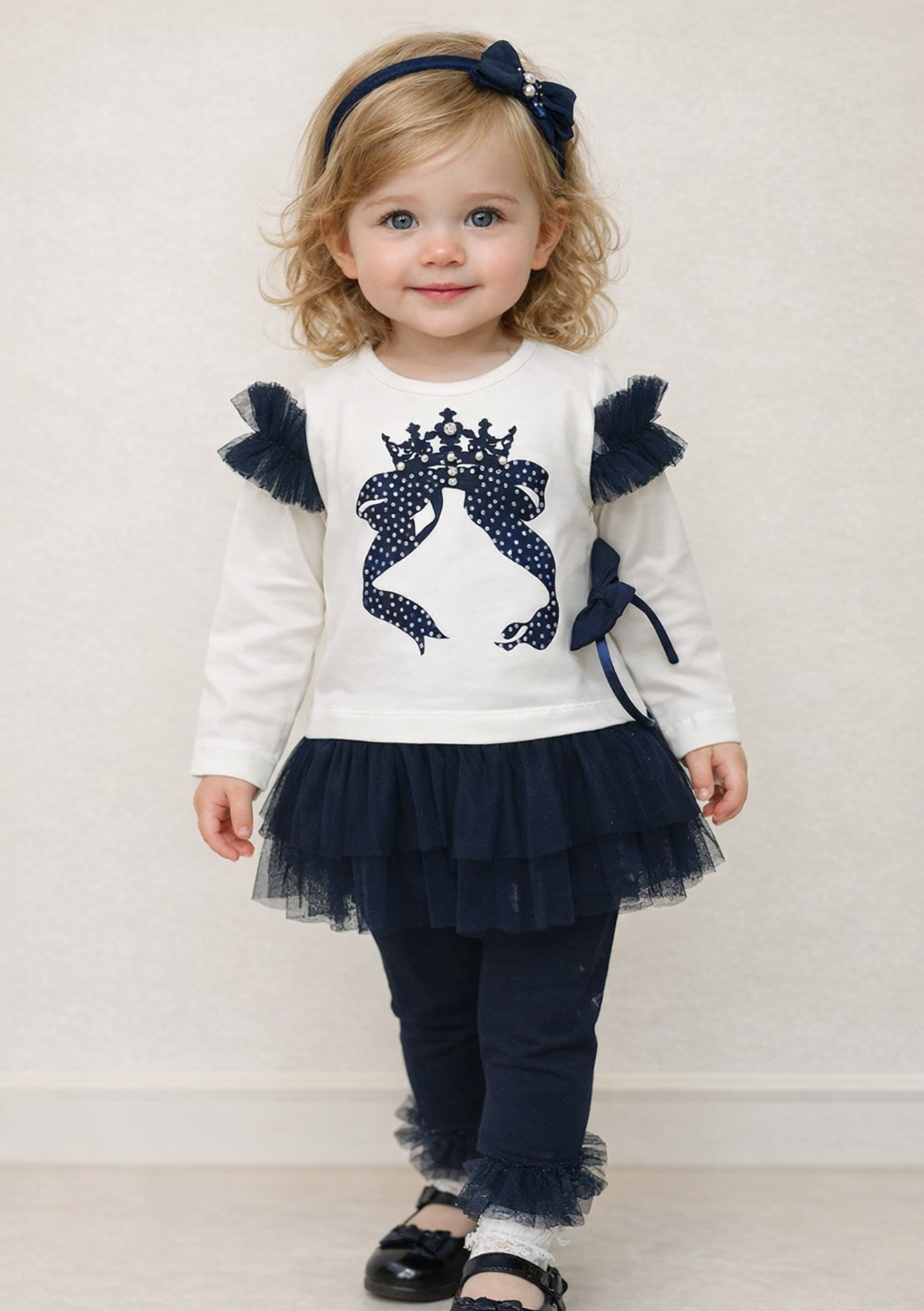 De top heeft een elegante print van een strik met kroontje, afgewerkt met subtiele steentjes voor een luxe effect. De schouders zijn voorzien van speelse tule accenten die de outfit nét wat specialer maken. Het rokje van zachte navy tule geeft volume en een feestelijke look. De bijpassende legging met tule details onderaan maakt de set compleet. Inclusief bijpassende haarband voor een perfecte finishing touch.