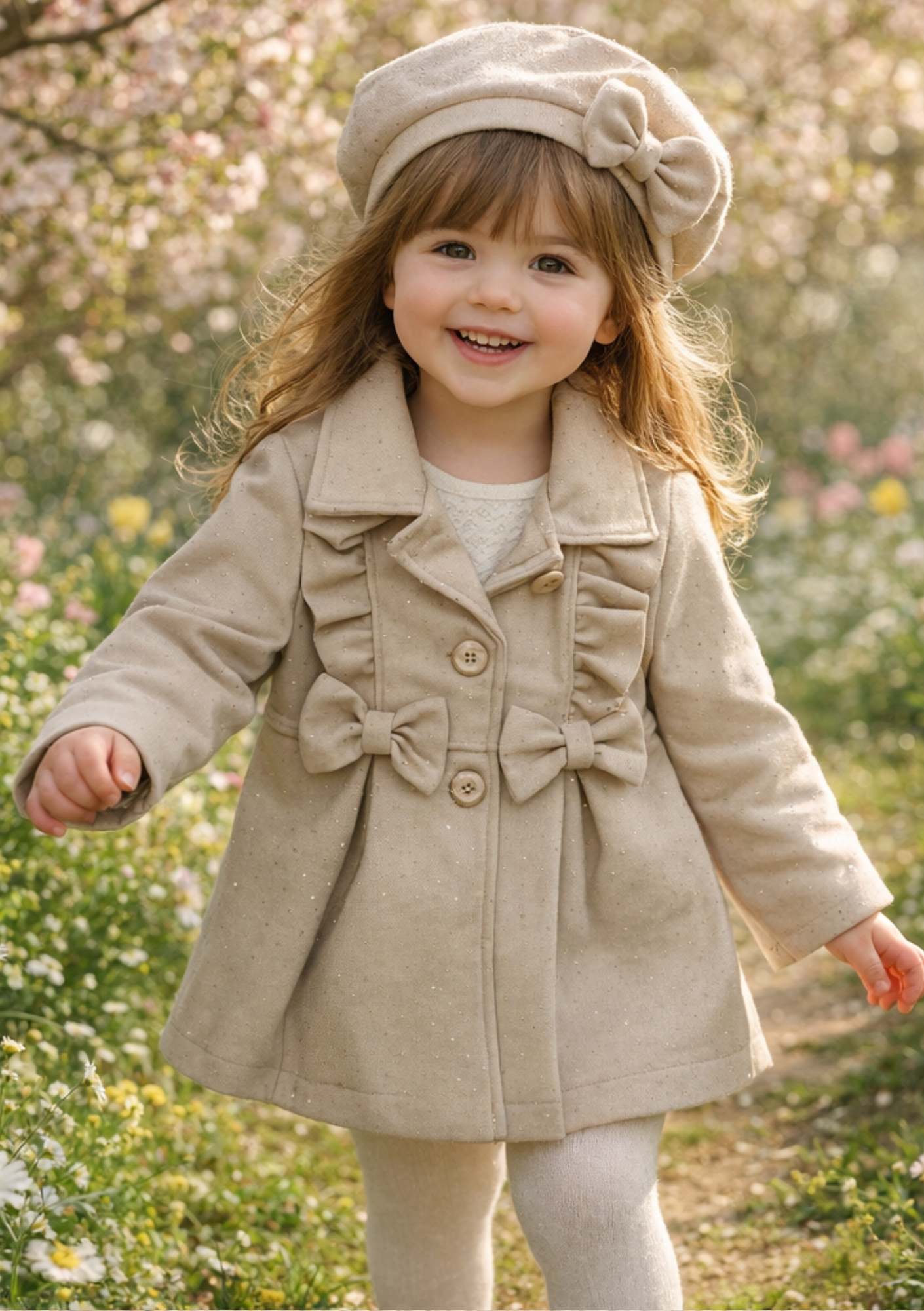 De bijpassende muts met strik maakt de look compleet. Zo is je kleine fashionista niet alleen stijlvol, maar ook beschermd tegen een frisse wind.