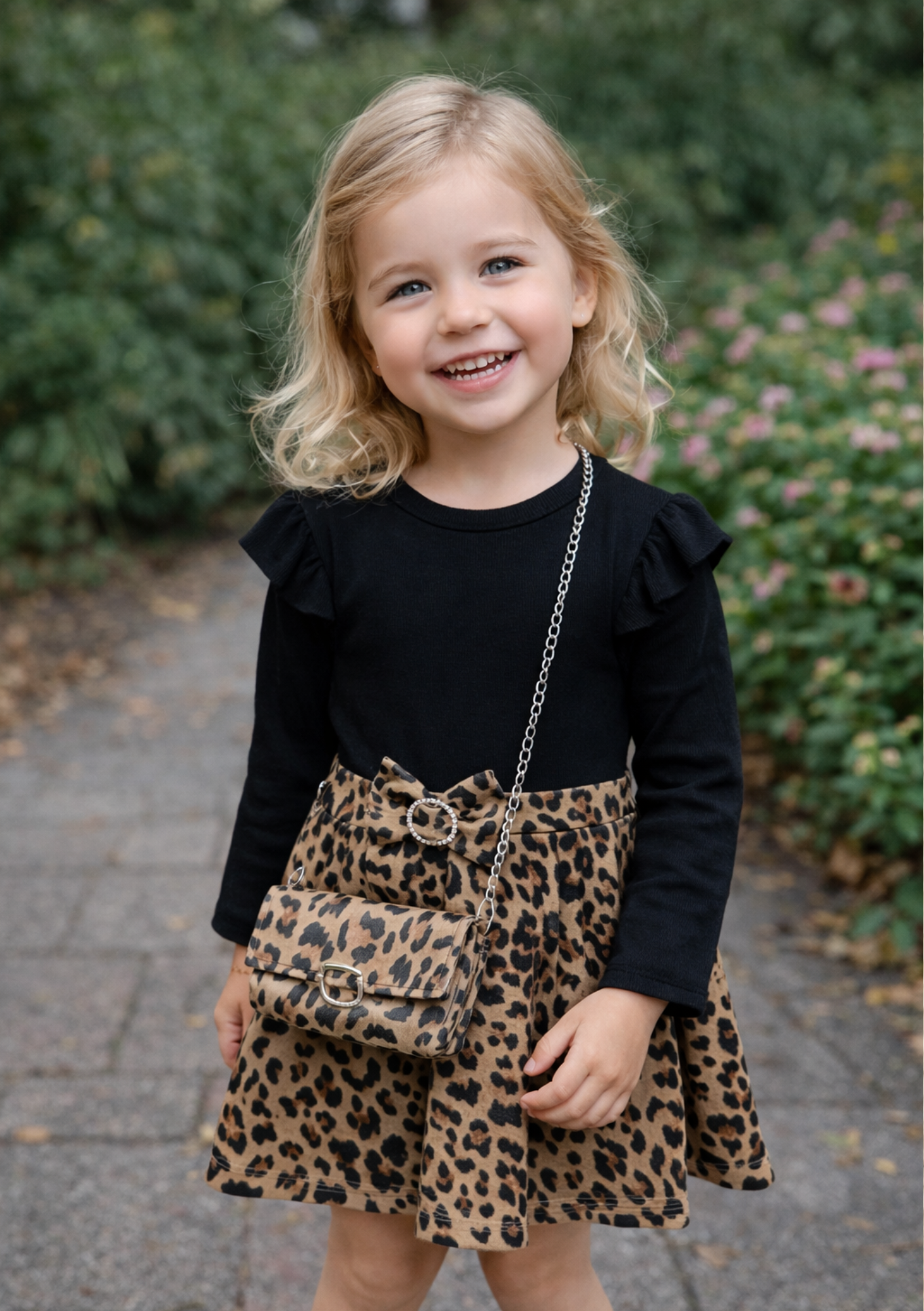 Op zoek naar een jurkje met pit? Dit zwart met panterprint jurkje voor meisjes van 1 t/m 6 jaar is allesbehalve saai. Bovenkant strak zwart, onderkant zwierig met een speelse panterrok en een opvallende strik in de taille. En ja – het bijpassende tasje zit er gewoon bij. Klaar is klaar.
