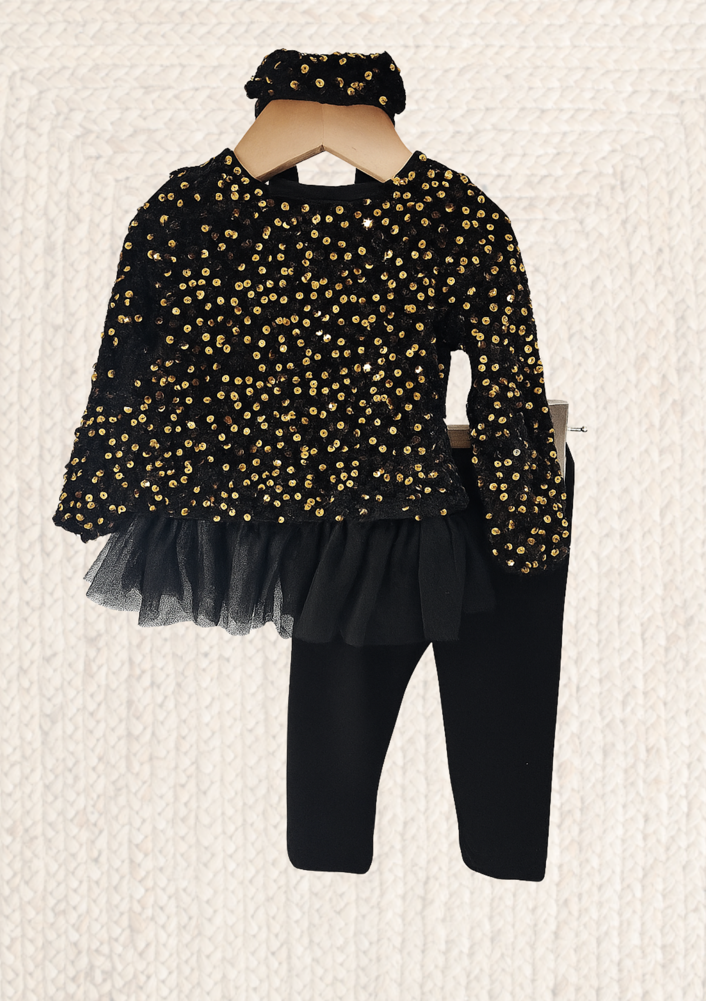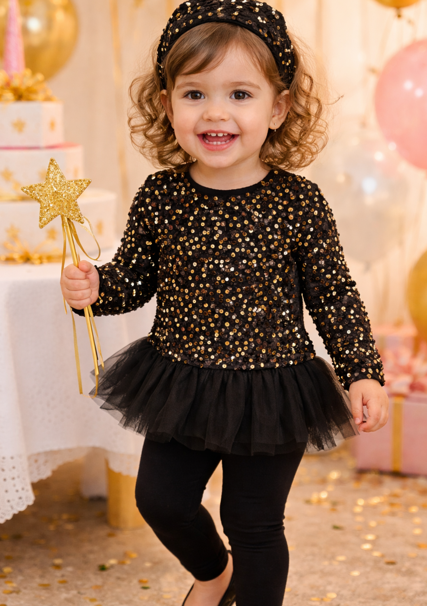 Klaar voor een feestje? Met deze zwarte 3-delige set steelt jouw kleine meid gegarandeerd de show. De top zit vol gouden pailletten die prachtig glinsteren bij elke beweging. De speelse tule rand geeft een echte party vibe, terwijl de zwarte legging zorgt voor comfort én bewegingsvrijheid. De bijpassende haarband maakt de look helemaal af.